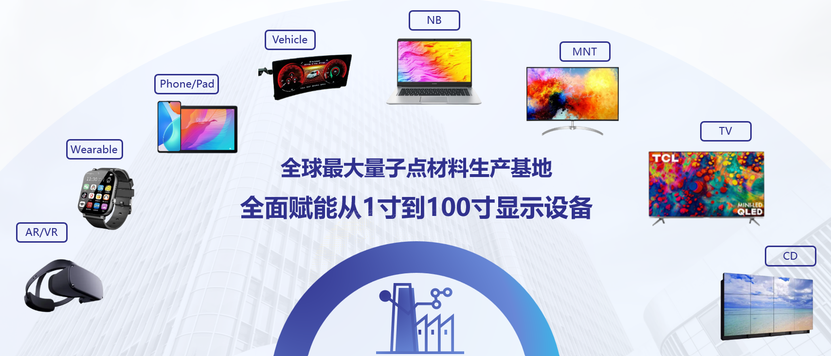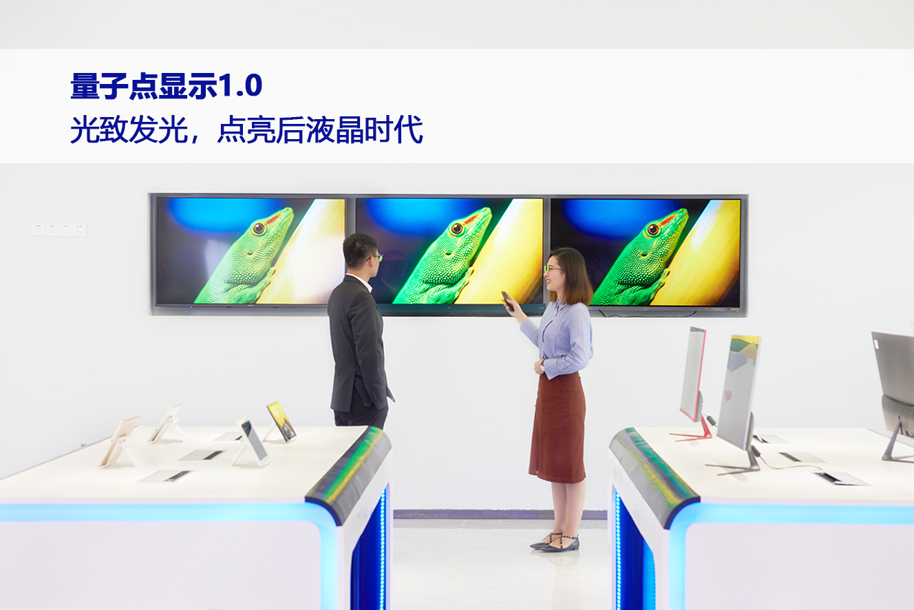 量子點(diǎn)光致發(fā)光顯示產(chǎn)品結(jié)合新一代納米量子點(diǎn)材料和高性能聚合物材料,采用遠(yuǎn)程激發(fā)技術(shù),將藍(lán)光轉(zhuǎn)化為明亮的綠光和鮮艷的紅光,能夠激發(fā)產(chǎn)生高純度的色彩光譜,色域更高,帶來顛覆性的畫質(zhì)革命,且具有光源功耗低、使用壽命長、節(jié)能環(huán)保更健康的優(yōu)點(diǎn),能廣泛應(yīng)用于AR/VR、手機(jī)、平板、筆電、顯示器、電視、商顯等不同尺寸、不同領(lǐng)域的終端產(chǎn)品。
